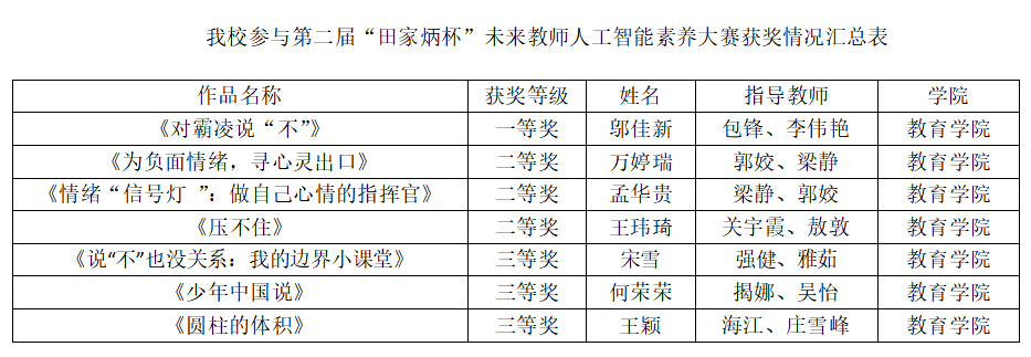 本次大赛以贯彻落实《教育强国建设规划纲要(2024—2035年)》要求,深化人工智能助推教师队伍建设,培养造就适应数智时代需要的卓越教师,促进人工智能助力教育变革为目标,前期历经东北“三省一区”未来教师数字素养大赛预赛、复赛层层选拔,最终于10月初确定来自15所高校的75位选手入围决赛。我校教育学院高度重视赛事参与,精心遴选优秀学生备赛,最终7位学生入围了“立德树人”“课堂教学”“班级管理”三个主题的决赛,并取得了佳绩。