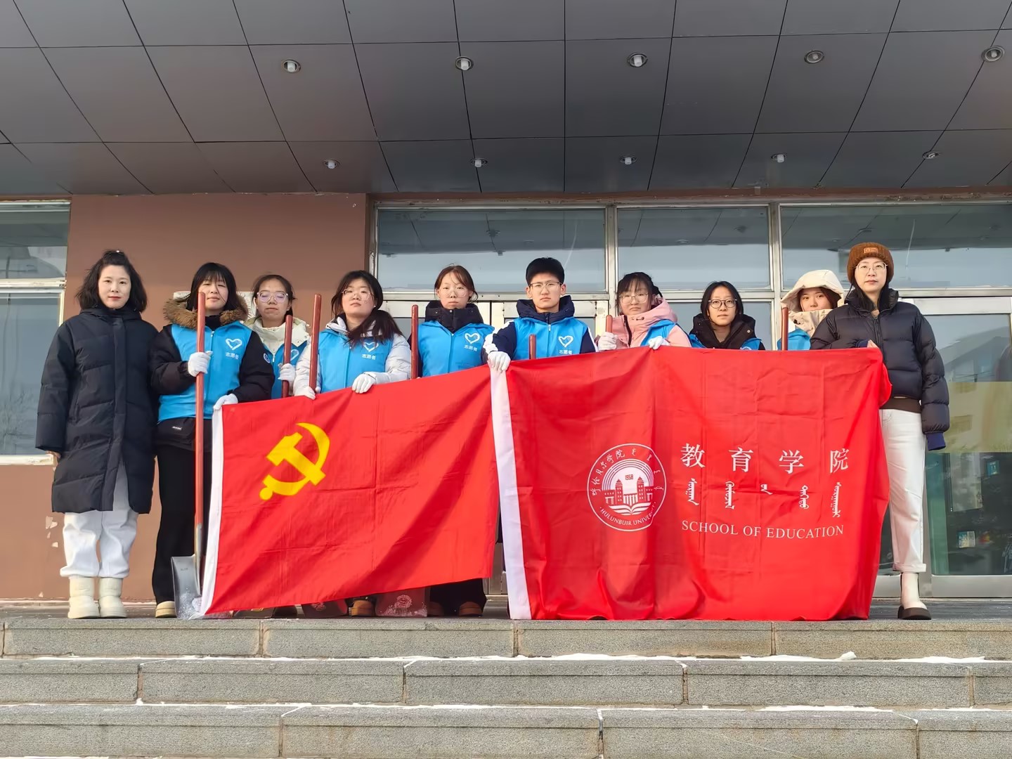 3月3日,在“学雷锋纪念日”到来之际,为传承和弘扬雷锋精神,增强党员的责任意识与服务意识,教育学院学生党支部开展了“清扫校园积雪 践行雷锋精神”主题党日。教育学院学生党支部书记萨仁图亚、党支部教师党员、学生党员代表及积极分子参加此次活动。