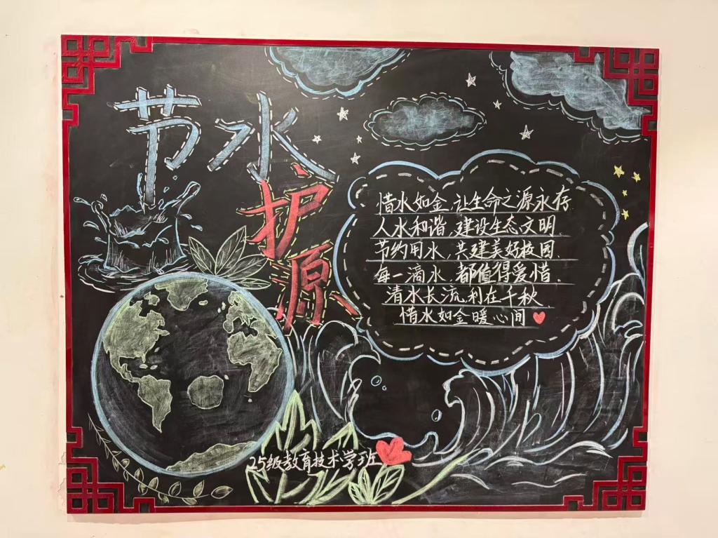 我院组织同学们开展节水主题黑板报创作活动,用粉笔勾勒节水愿景,用色彩传递护水决心。同学们以班级为单位,围绕“节水护水”核心主题,在黑板上精心设计版面,将地球、水滴、水龙头等元素融入创作,用生动的图案和醒目的标语,展现对水资源保护的深刻理解。一幅幅黑板报主题鲜明、内容充实,既美化了学院环境,也让节水意识在潜移默化中浸润同学们的日常,成为教育学院的节水宣传窗口。