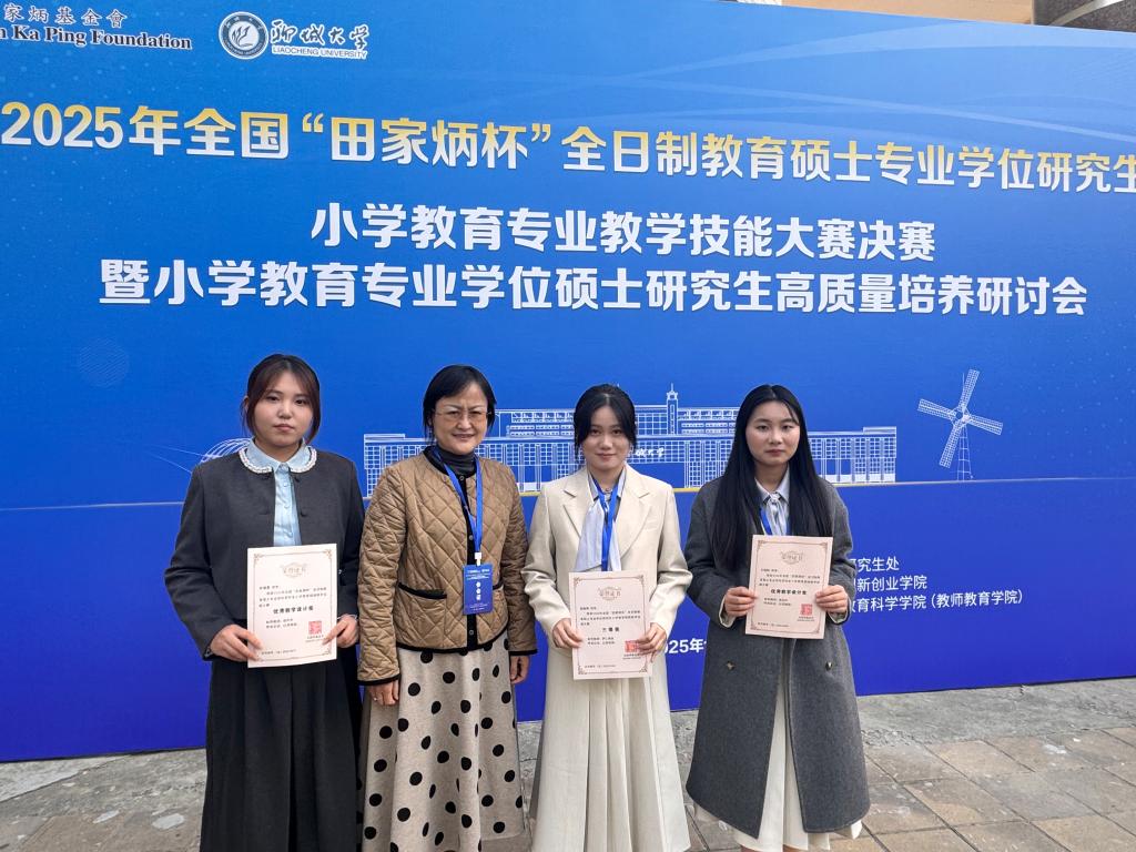 大赛由田家炳基金会冠名,聊城大学主办,是我国层次最高、规模最大的教育硕士教学技能竞赛。大赛赛程历时四个月,共设置了小学语文、小学数学、小学英语、小学科学四个赛道。初赛共有115所教育硕士培养高校的553名小学教育专业全日制教育硕士研究生参赛。经过角逐,共有104所院校的278名选手参与决赛。大赛最终评选出一等奖33项、二等奖55项、三等奖110项、优秀教学设计奖76项、优秀指导教师奖88项。我校教育学院2023级小学教育专业研究生张琳琳、乔静雯、王艳秋在比赛中表现优异,共获得三等奖1项、优秀教学设计奖2项,展现了扎实的专业功底与卓越的教学风采。